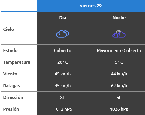 A la noche, el clima rondará los 9 grados, mientras que los vientos serán del sudeste y soplarán a una velocidad de entre 42 y 50 kilómetros por hora. La probabilidad de lluvia estaría en el orden del entre 10 y 40 por ciento para esta franja del día.