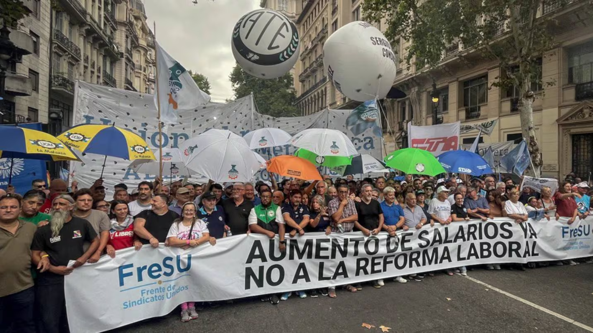Los gremios combativos agrupados en el Frente de Sindicatos Unidos (FreSU) se movilizan este viernes al Congreso mientras el Senado trata la reforma laboral, sin el acompañamiento de la Confederación General del Trabajo (CGT). La protesta comenzó al mediodía en el centro porteño y tuvo como epicentro el debate en la Cámara Alta.