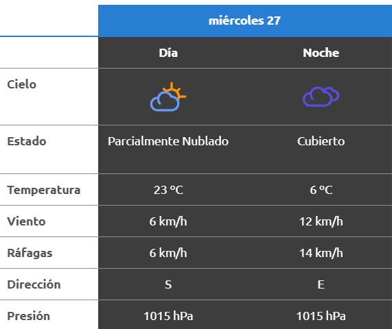 El parte del servicio meteorológico prevé que para después del mediodía el cielo estará parcialmente nublado y los vientos del sector norte tendrán velocidades estimadas de entre 13 y 22 km/h. La temperatura pronosticada sería de 23 grados.